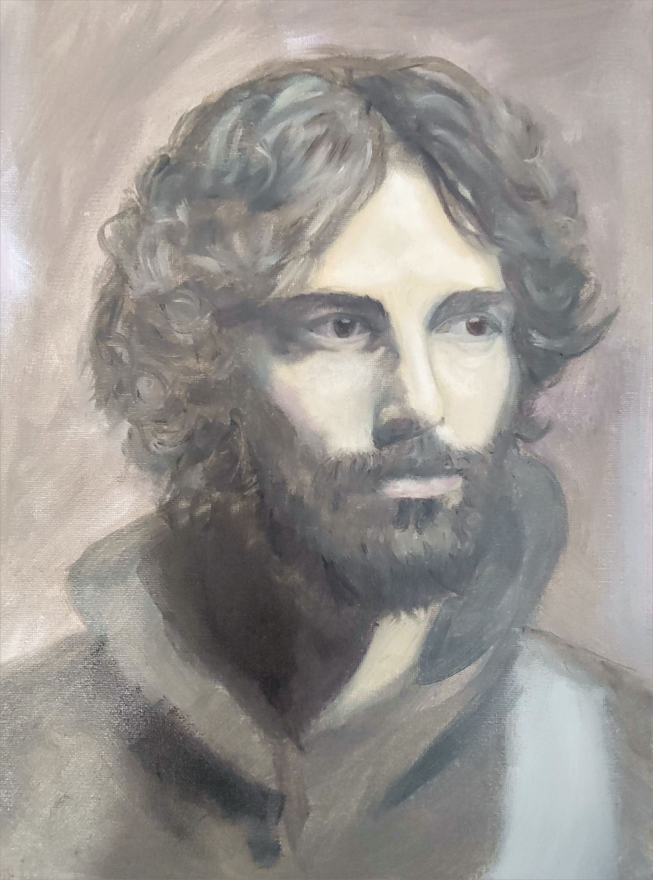 The painting is done in muted colors, primarily in gray-brown shades, giving the figure a classical sternness. The use of light and shadow plays a significant role in adding depth and conveying the man’s emotional state, presenting him as calm yet strong and expressive. His clothing is minimalistic, allowing the viewer’s attention to remain on his face and inner emotions.